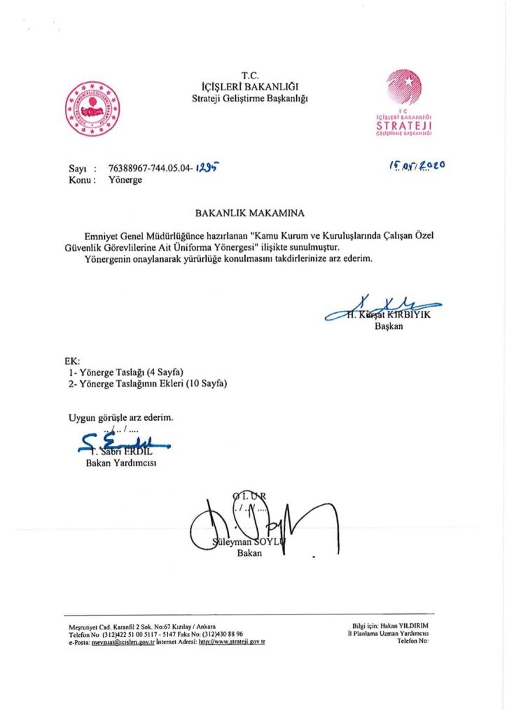 “KAMU KURUM VE KURULUŞLARINDA ÇALIŞAN ÖZEL GÜVENLİK GÖREVLİLERİNE AİT ÜNİFORMALARA İLİŞKİN YÖNERGE, SAYIN BAKANIMIZ SÜLEYMAN SOYLU TARAFINDAN İMZALANARAK YÜRÜRLÜĞE GİRMİŞTİR.