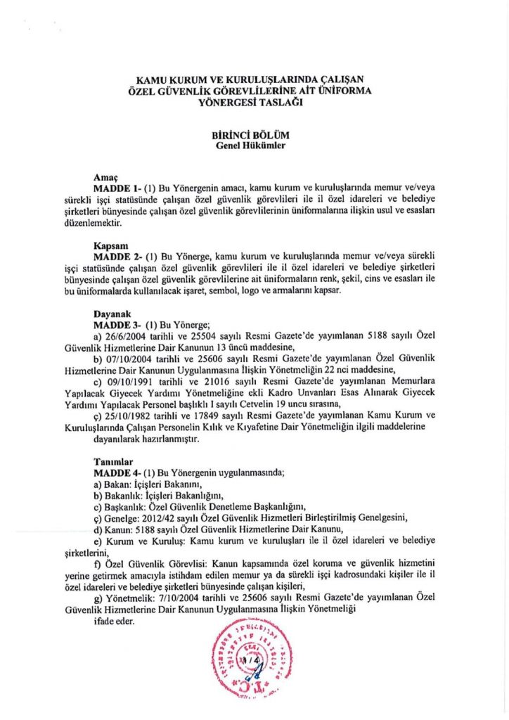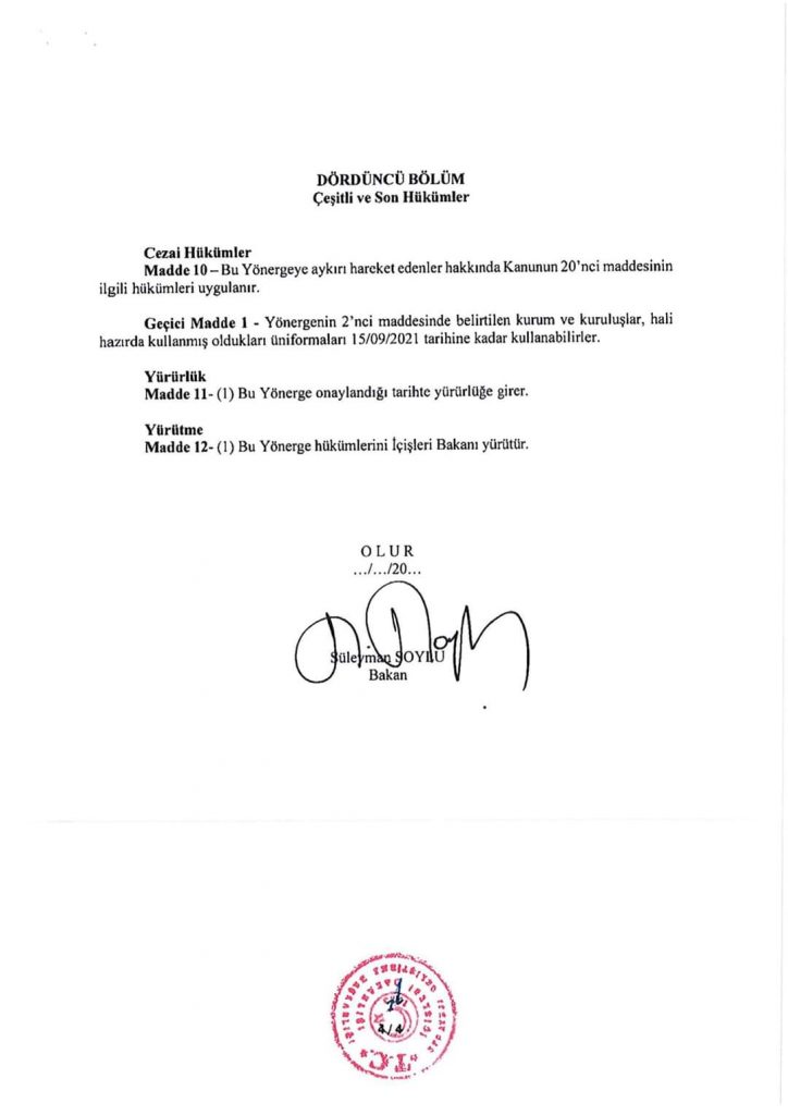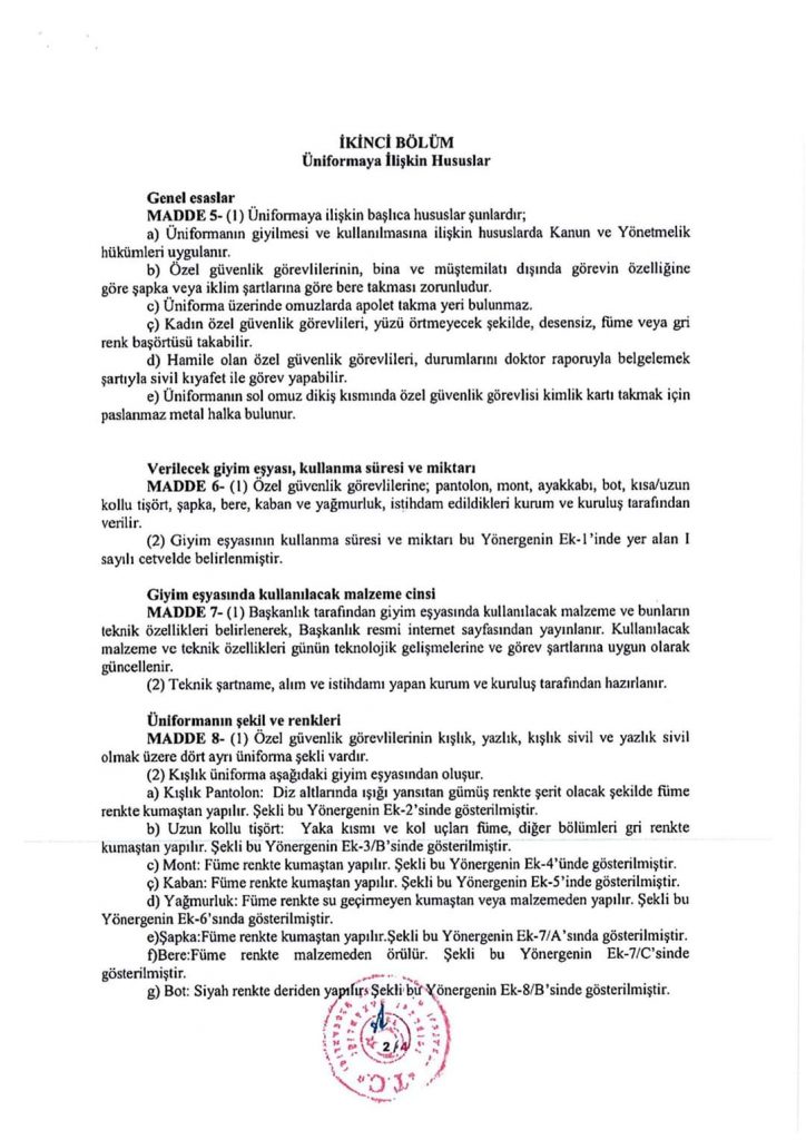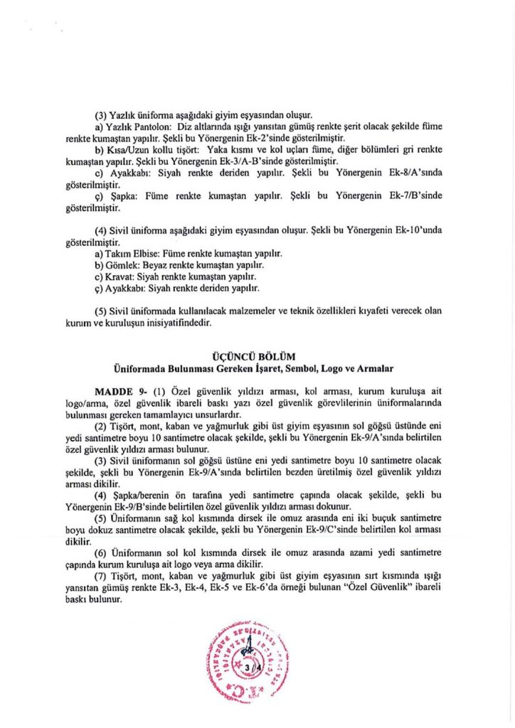 Emniyet Genel Müdürlüğü Özel Güvenlik Denetleme Başkanlığı tarafından yayımlanan duyuruda, tek tip kıyafet yönergesinin İçişleri Bakanı Süleyman SOYLU tarafından imzalandığı ve yönergenin yürürlüğe girdiği belirtildi.